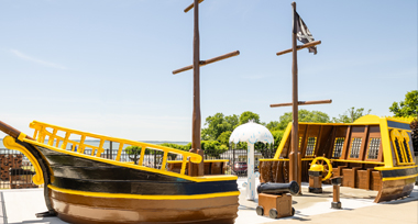 We are excited to announce that we expanded our pool area and built a pirate ship themed splash pad! The pirate ship splash pad is a memorable attraction for kids and adults alike. It features an interactive cannon, a ship's wheel, a treasure chest, and randomly squirting jets.